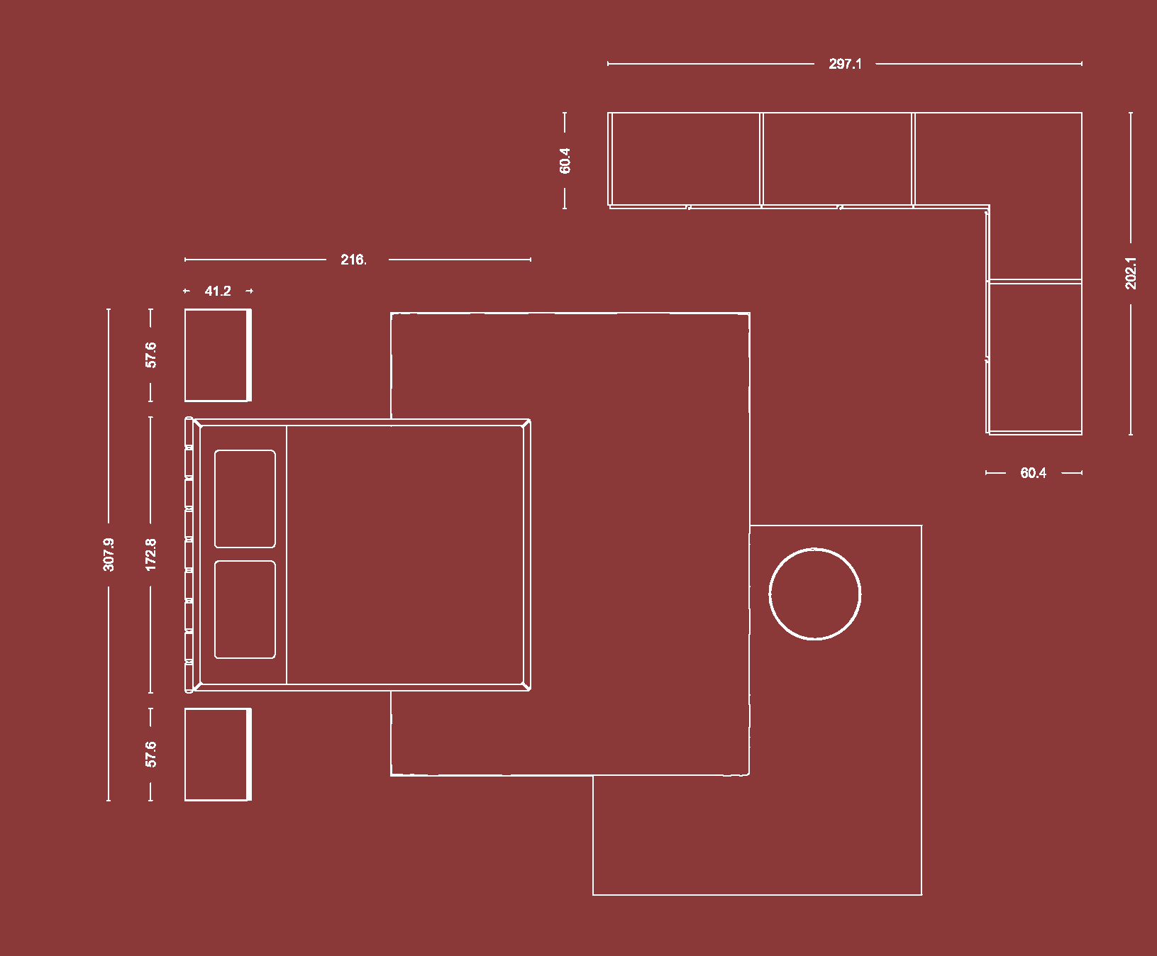 - Betteinheit gesamt: 308 × 100 × 216.4 cm
