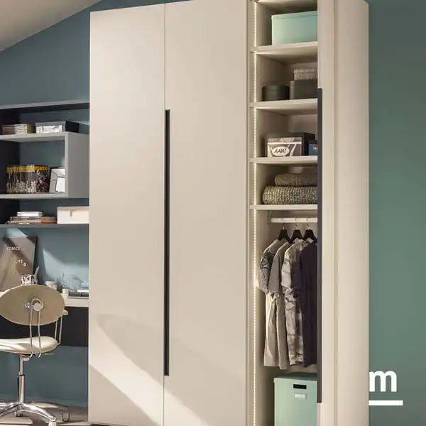 Schlanke, glatte Türen mit eingelassener Griffleiste („Rail“); üppig nutzbarer Innenraum dank langem Kleiderrohr, variabler Regaleinteilung und Dämpfungsscharnieren -