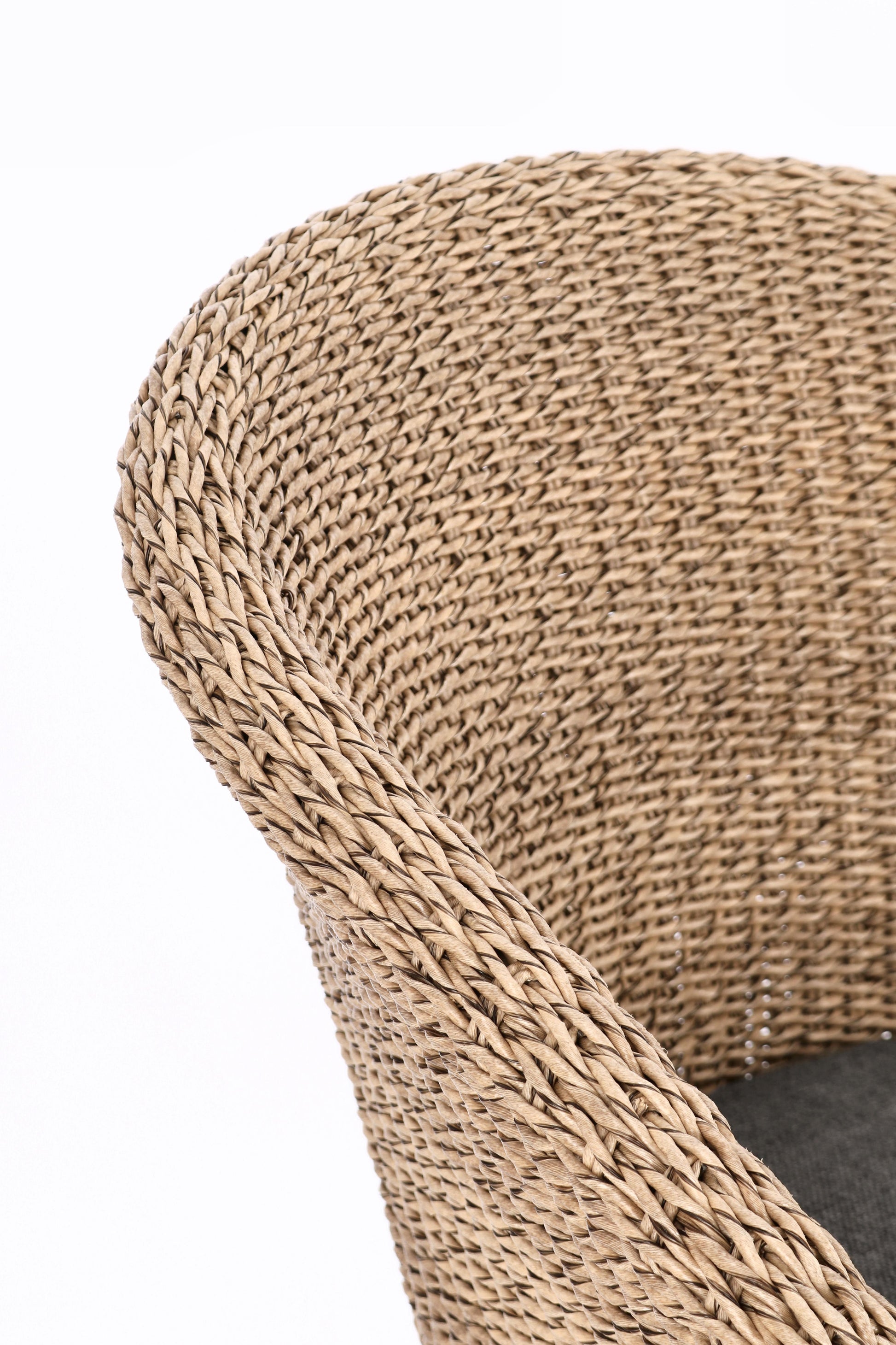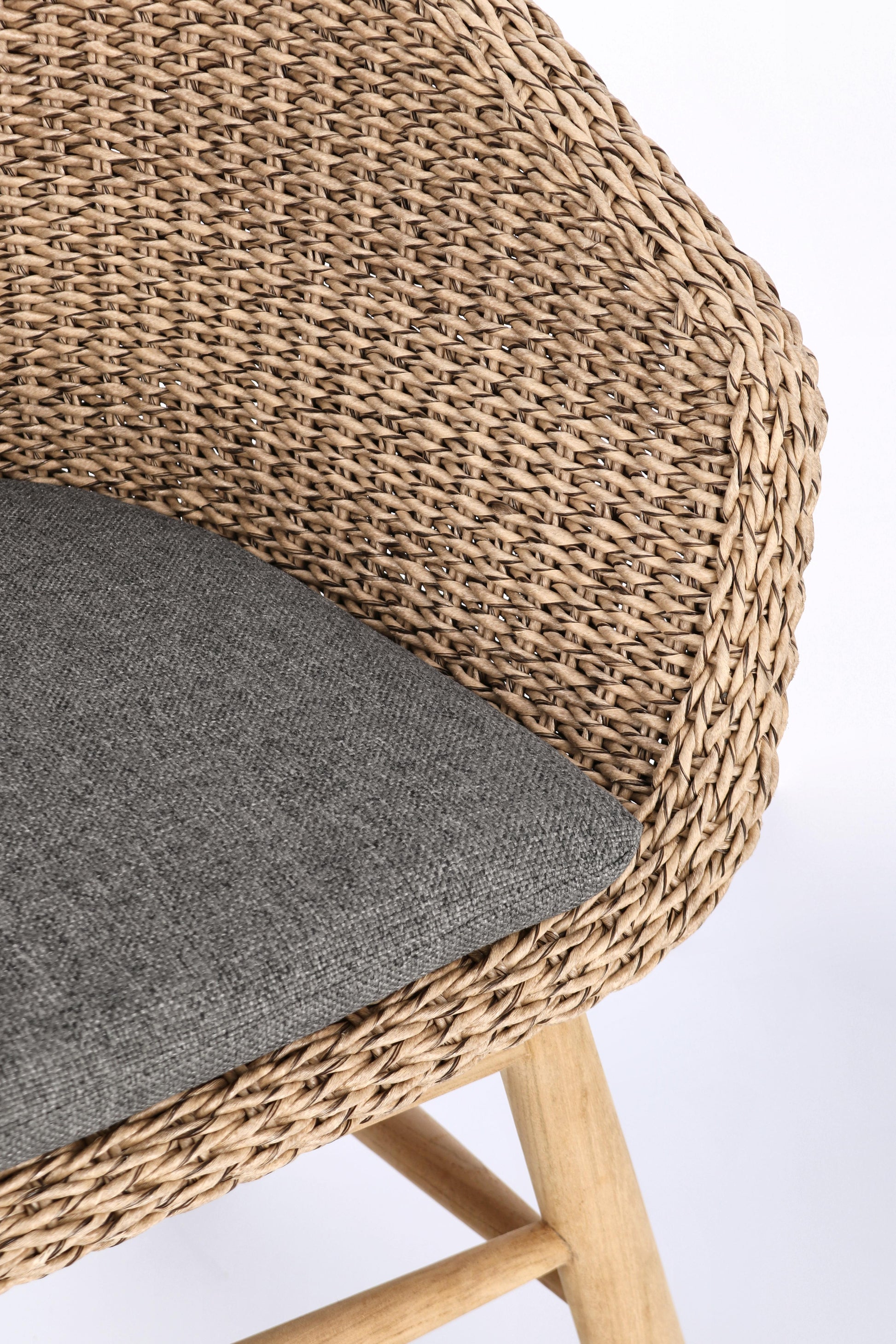 Das pulverbeschichtete Aluminiumgestell bietet zuverlässige Stabilität ohne Rostbildung. Das Geflecht aus hochwertigem Kunstfaser-Rope im Abaca‑Look wirkt natürlich, ist UV‑beständig und dabei besonders pflegeleicht.