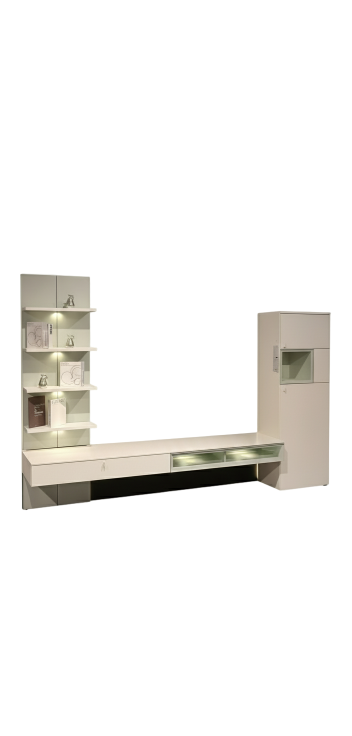 Entdecken Sie die Wohnwand X1 – ein modernes Wandsystem, das Funktionalität und Eleganz vereint. Mit ihrer durchdachten Kombination aus Hängelowboard, Gleitvitrine und vier variablen Wandboards schaffen Sie flexible Stauraum- und Präsentationslösungen. Das edle Farbspiel zwischen kristallweissem Matt und jadegrünem Matt verleiht Ihrem Wohnraum eine zeitlose Ästhetik. Die integrierte LED-Beleuchtung setzt Ihre liebsten Objekte perfekt in Szene. Mit grosszügigen Abmessungen von 330cm Breite und 207cm Höhe passt sich die Wohnwand harmonisch an Ihre Raumgegebenheiten an. Ein durchdachtes Design für anspruchsvolle Einrichtungen.